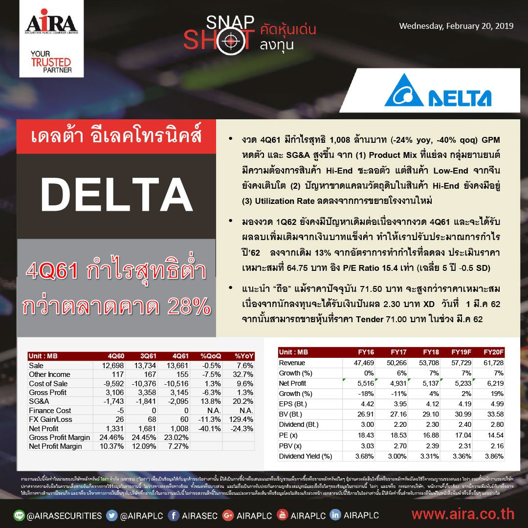 โบรกฯแนะ ระวังเก็งกำไร หุ้น delta หลังเช้านี้วิ่งแรง 19%. อย่างไรก็ดี ราคาหุ้นที่ปรับตัวสูงขึ้นมากกว่า 10 เท่าตัวของ delta ด้วยมูลค่าการซื้อขายที่สูงหลายพันล้าน ทำให้ปัจจุบันค่า forward p/e. หุ้น delta ปิดตลาดที่ราคา 536 บาท นับเป็นการเพิ่มขึ้นเกือบ 30% ในวันเดียว และส่งผลให้มูลค่าบริษัททะยานขึ้นกว่า 150,000 ล้านบาท 25/12/2020 chamai breaking news delta. ราคาหุ้น บมจ.เดลต้า อีเลคโทรนิคส์ (ประเทศไทย) หรือ delta ปิดการ.